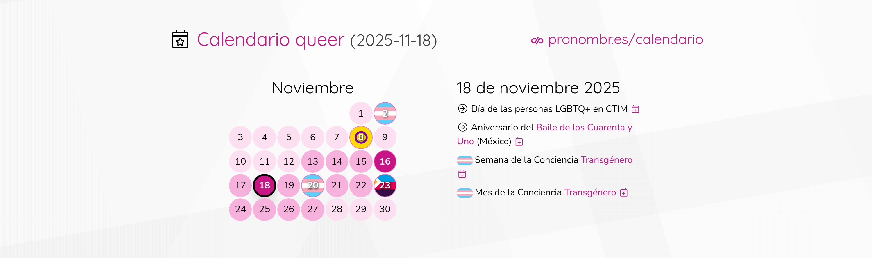 Texto alternativo: Una bandera rectangular con cinco franjas horizontales del mismo ancho: Azul, rosa, blanco, rosa, azul Mes de la Conciencia Transgénero